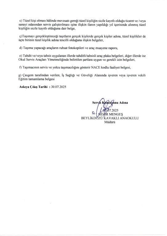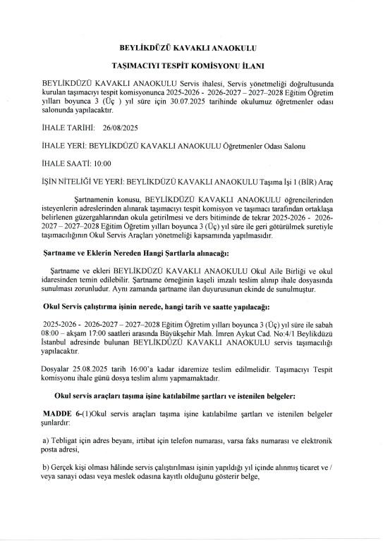 2025-2026 , 2026-2027 , 2027-2028 EĞİTİM ÖĞRETİM YILLARI İÇİN OKULUMUZDA ÖĞRENCİ TAŞIMACILIĞI YAPMAK ÜZERE İHALE YAPILACAKTIR.